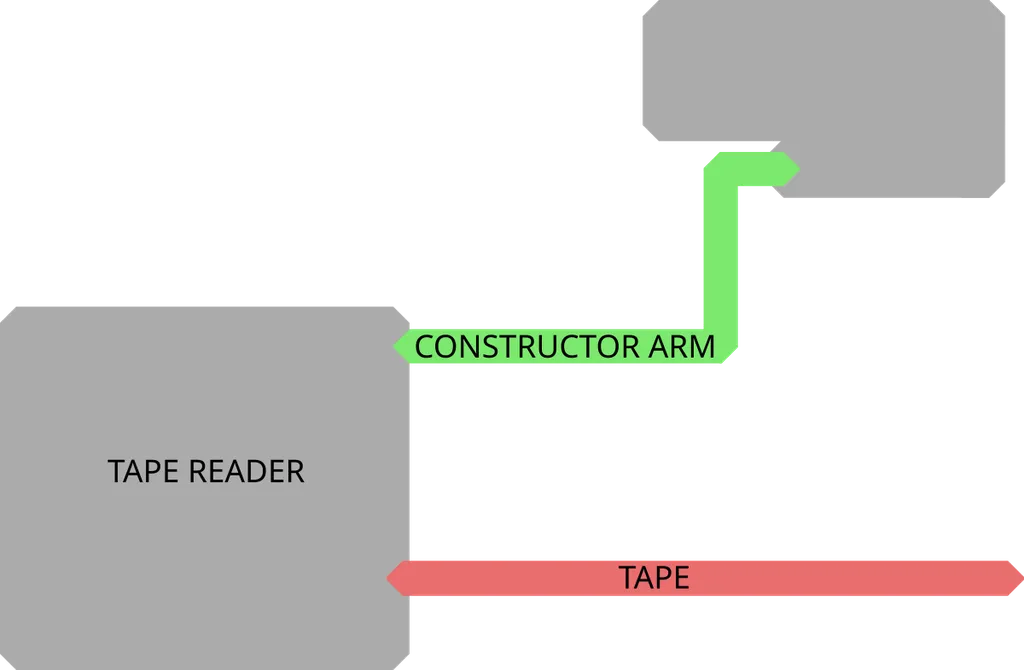 We just need to write the right program so that the correct stream of excitations/non-excitations goes through the system and constructs a copy of the tape reader, the construction arm, and of the tape